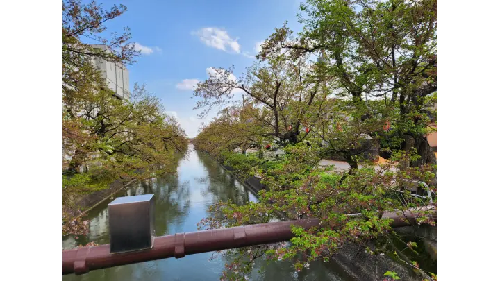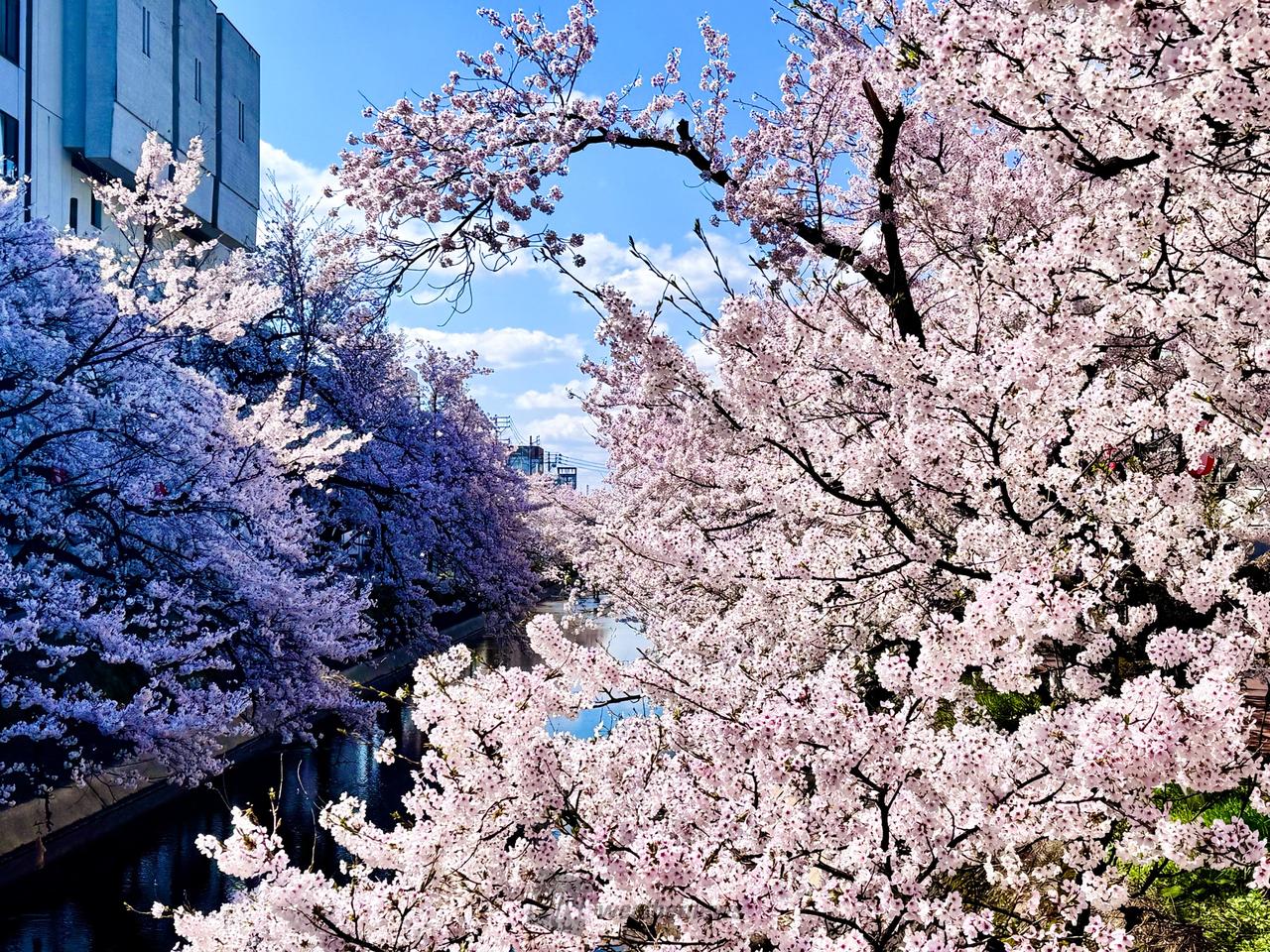 長岡駅近くを流れる用水路沿い約1㎞にわたって、川面に覆いかぶさるように立派な桜が連なります。