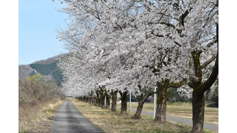 胎内市夏井地区にある「胎内川河川敷千本桜」は、雪深い地域ならではの春の訪れを感じられる名所です。毎年4月中旬頃になると、飯豊連峰を源とする胎内川の上流部に沿って、約1kmにわたる染井吉野の桜並木が一斉に咲き誇ります。川沿いの両岸を淡い桜色が包み込み、せせらぎの音とともに歩ける並木道は、訪れる人を魅了する美しい景観として親しまれています。