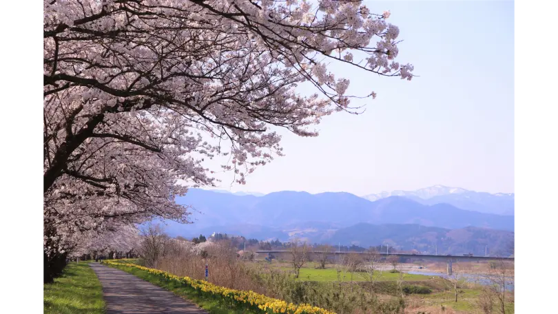 神通川の中州にある西神通・中神通は、周辺を堤防に囲まれた輪中地域で、4.8㎞の回廊の800本もの桜並木が続く「神通川さくら堤」と呼ばれています。「塩の千本桜」は、富山県の真ん中を流れる神通川の右岸、富山市塩に植えられた約1㎞、約200本のさくら堤で、水仙と桜のコラボレーションが楽しめるスポットです。神通川さくら堤と塩の千本桜をあわせて1000本もの桜並木は、「富山さくらの名所70選」にも選ばれており、全国にも誇れる規模の桜スポットです。