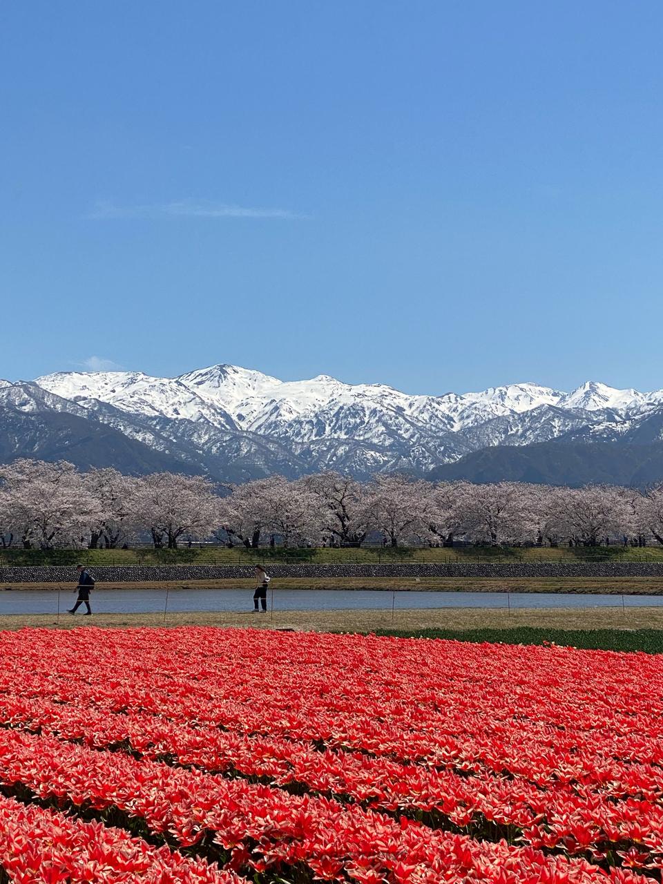 残雪の朝日岳、白馬岳を中心とした北アルプス連峰を背景に舟川の両岸に約280本のソメイヨシノが咲き誇ります。周辺のチューリップ畑、菜の花畑と開花の時期がかさなれば自然がつくりだすみごとな春の四重奏が楽しめます。