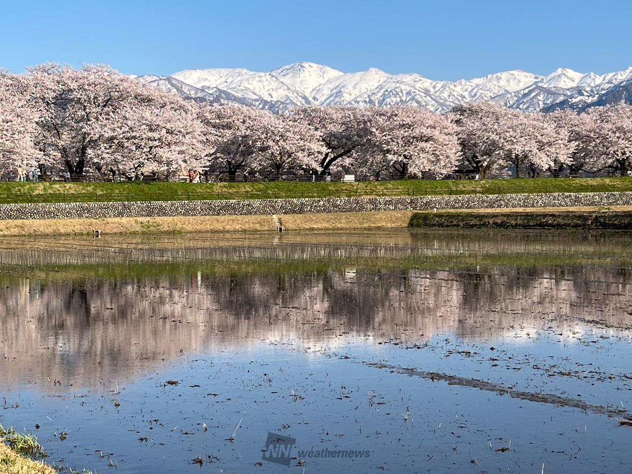残雪の朝日岳、白馬岳を中心とした北アルプス連峰を背景に舟川の両岸に約280本のソメイヨシノが咲き誇ります。周辺のチューリップ畑、菜の花畑と開花の時期がかさなれば自然がつくりだすみごとな春の四重奏が楽しめます。