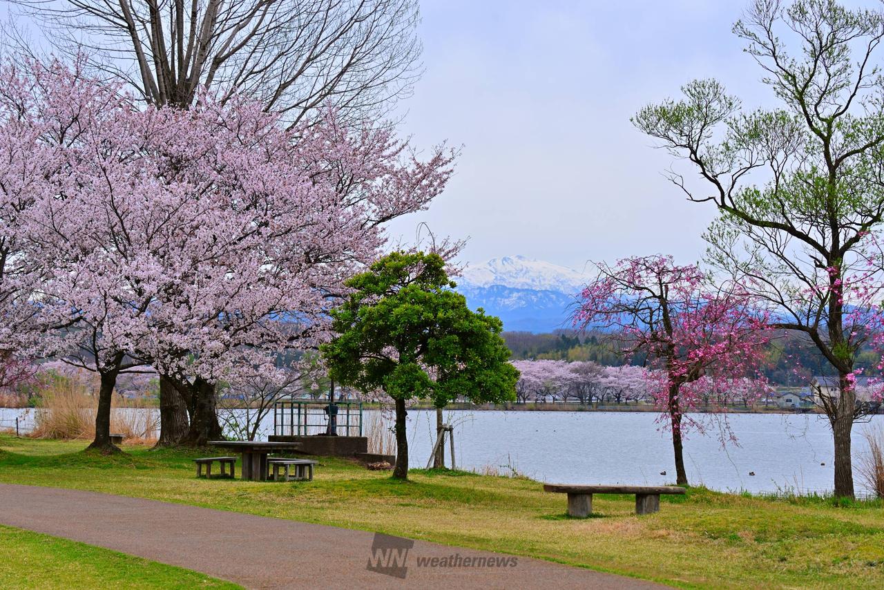 北園地、西園地から望む白山、桜並木、木場潟や、令和6年4月に完成した木場潟全体が見渡せる展望台からのサクラ並木と北陸新幹線との組合わせがおすすめ
