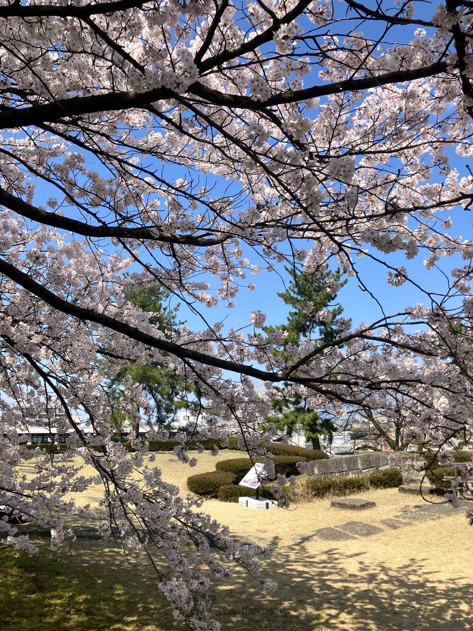 福井駅から徒歩5分に位置する福井城址は、400年以上たった今も本丸のお堀と石垣が現存しています。山里口御門や御廊下橋が復元されており、現在では坤櫓(ひつじさるやぐら)や土塀の復元工事が進められています。開花時期には、天守台や石垣上のソメイヨシノと青みがかった笏谷石の石垣が織りなす情景が楽しめます。桜が散り始めると、お堀に舞い降りた花びらが水面に浮かぶ花筏(はないかだ)の光景が広がります。石垣は毎日ライトアップされており、桜の開花時期は石垣が桜色に染まります。表情豊かな福井城址の桜をお楽しみください!