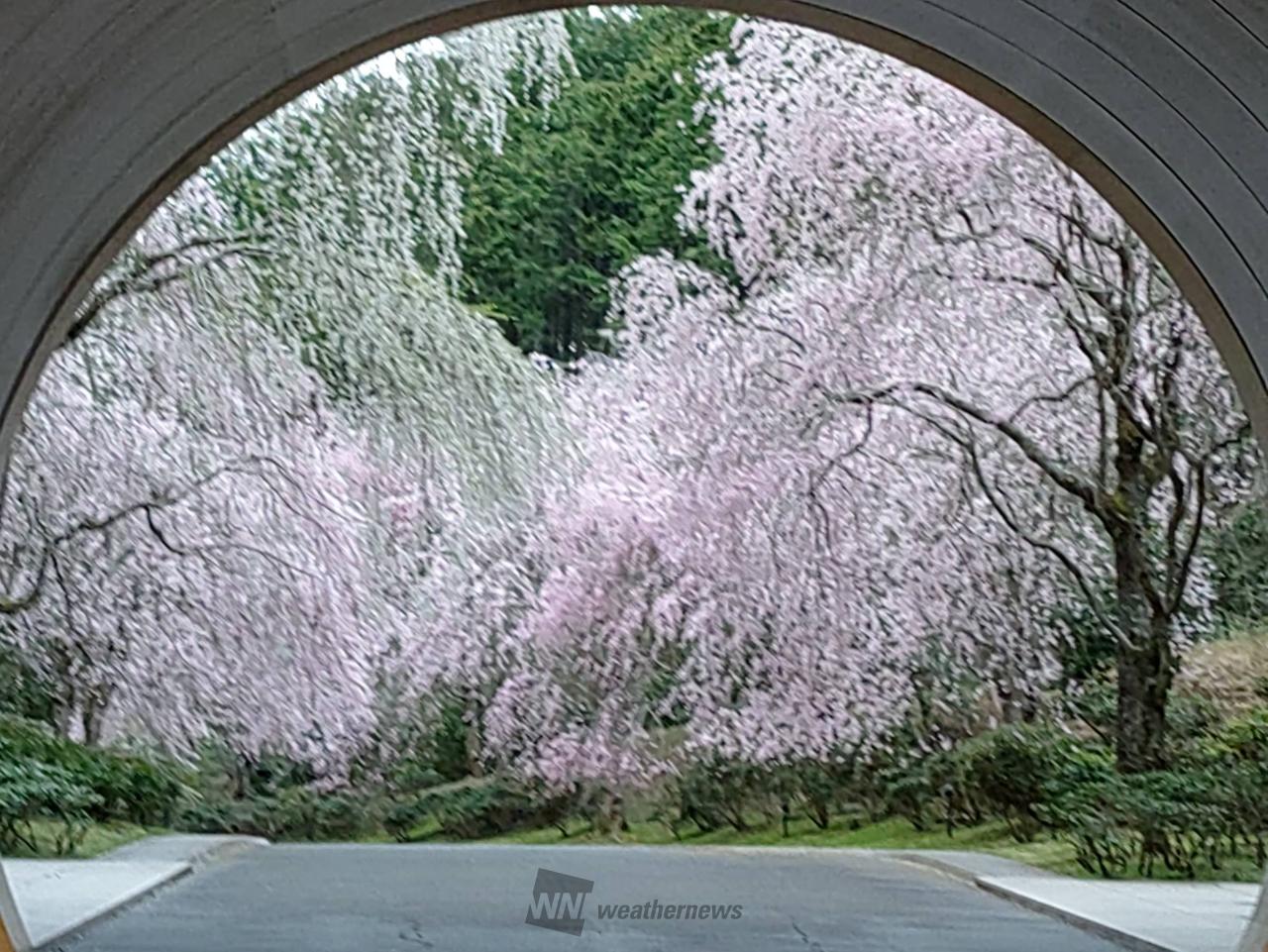 レセプション棟から美術館棟に向かい、桜並木を通り抜け途中にあるトンネルの中から振り返るとの壁面に桜のピンク色が映り込んだ景色がご覧いただけます。