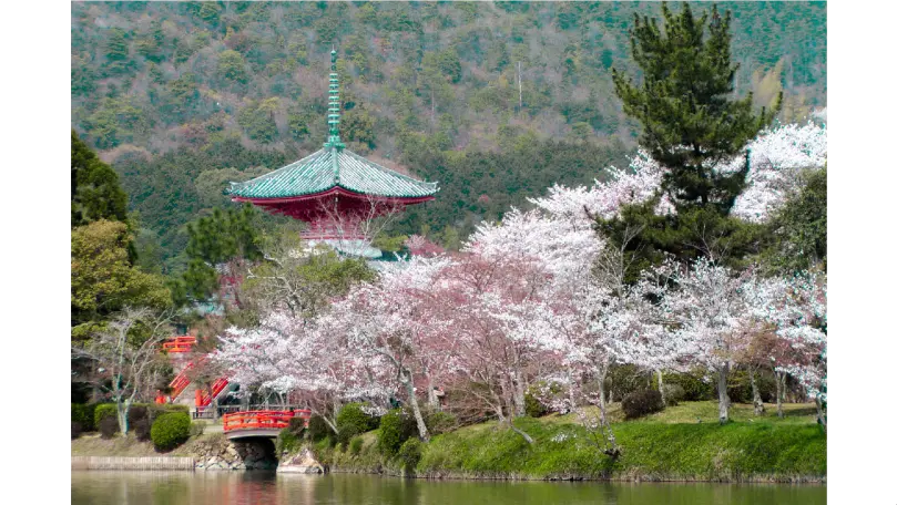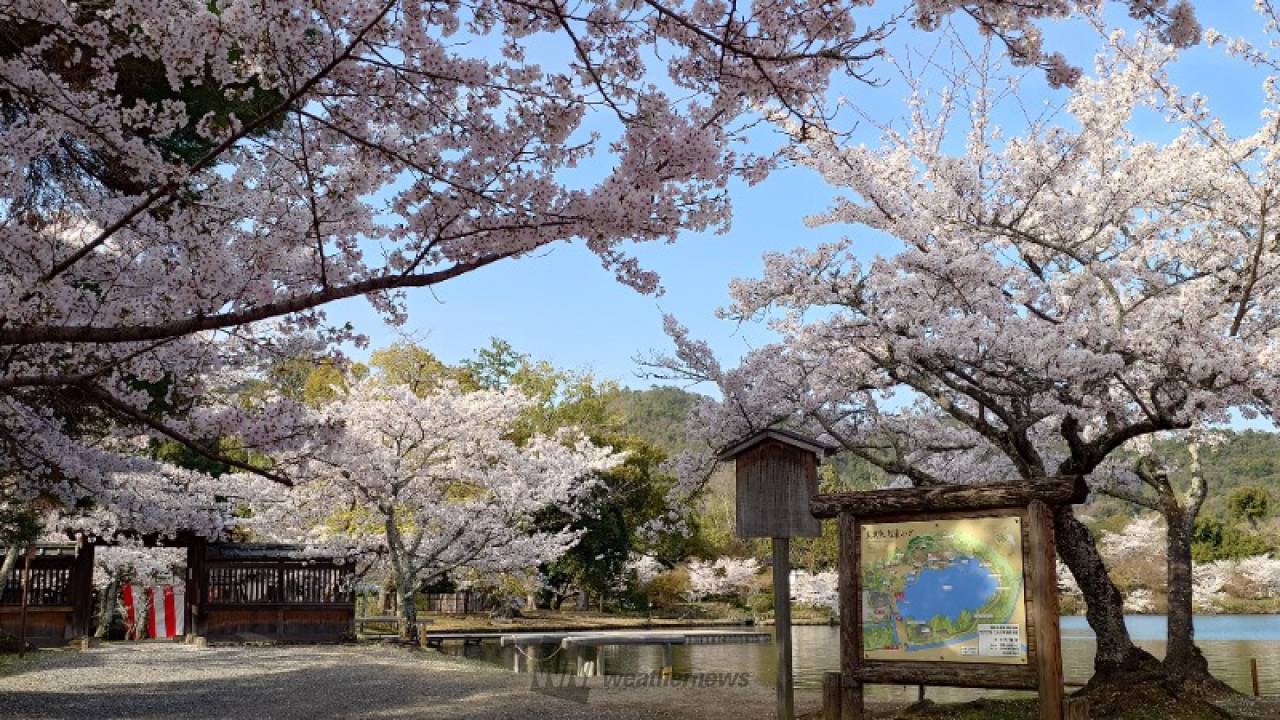 例年3月下旬から4月上旬に見頃を迎えます。嵯峨天皇が、嵯峨院を造営した際に作庭した、現存する日本最古の庭池とされる大沢池の水面に桜が映り、より一層の美しさを湛えます。飲食禁止、ドローン使用不可、ペット入場禁止(介助犬除く)。