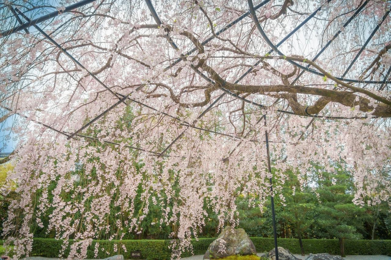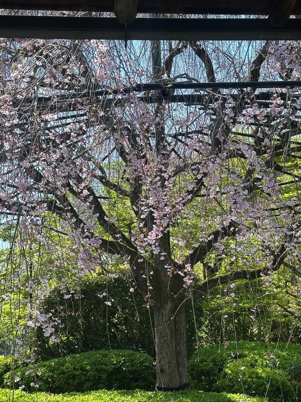 境内の余香苑に入ると、目の前で優雅に枝を伸ばすベニシダレザクラが。おすすめビュースポットは、お庭の西側にある藤棚の下から眺め。手前の池、美しい刈り込みと流れる滝。その奥にパッと鮮やかな桜が庭全体に花を添えてくれます。ベニシダレザクラは、市内のソメイヨシノの見ごろを終える頃、見ごろを迎えております。