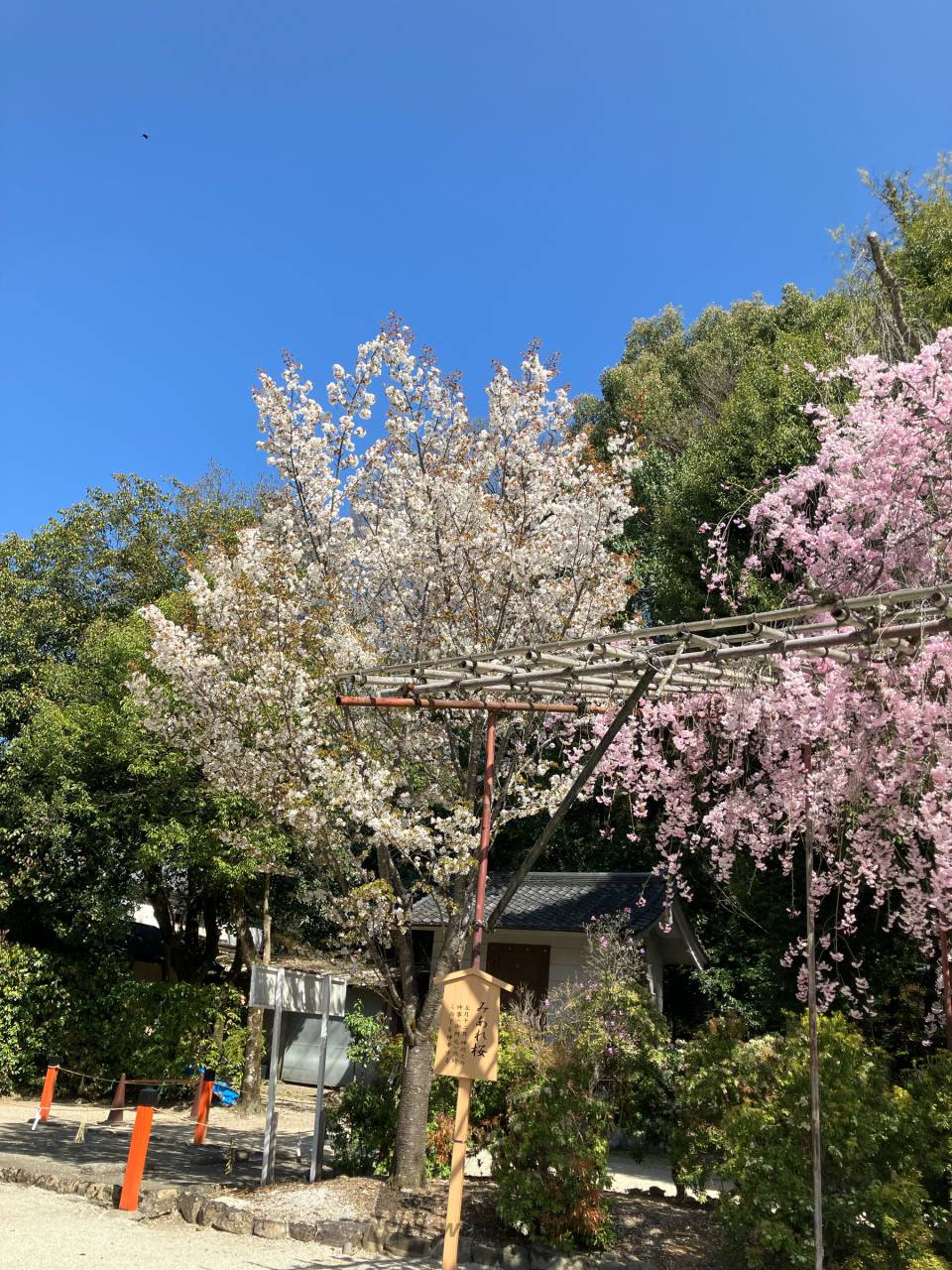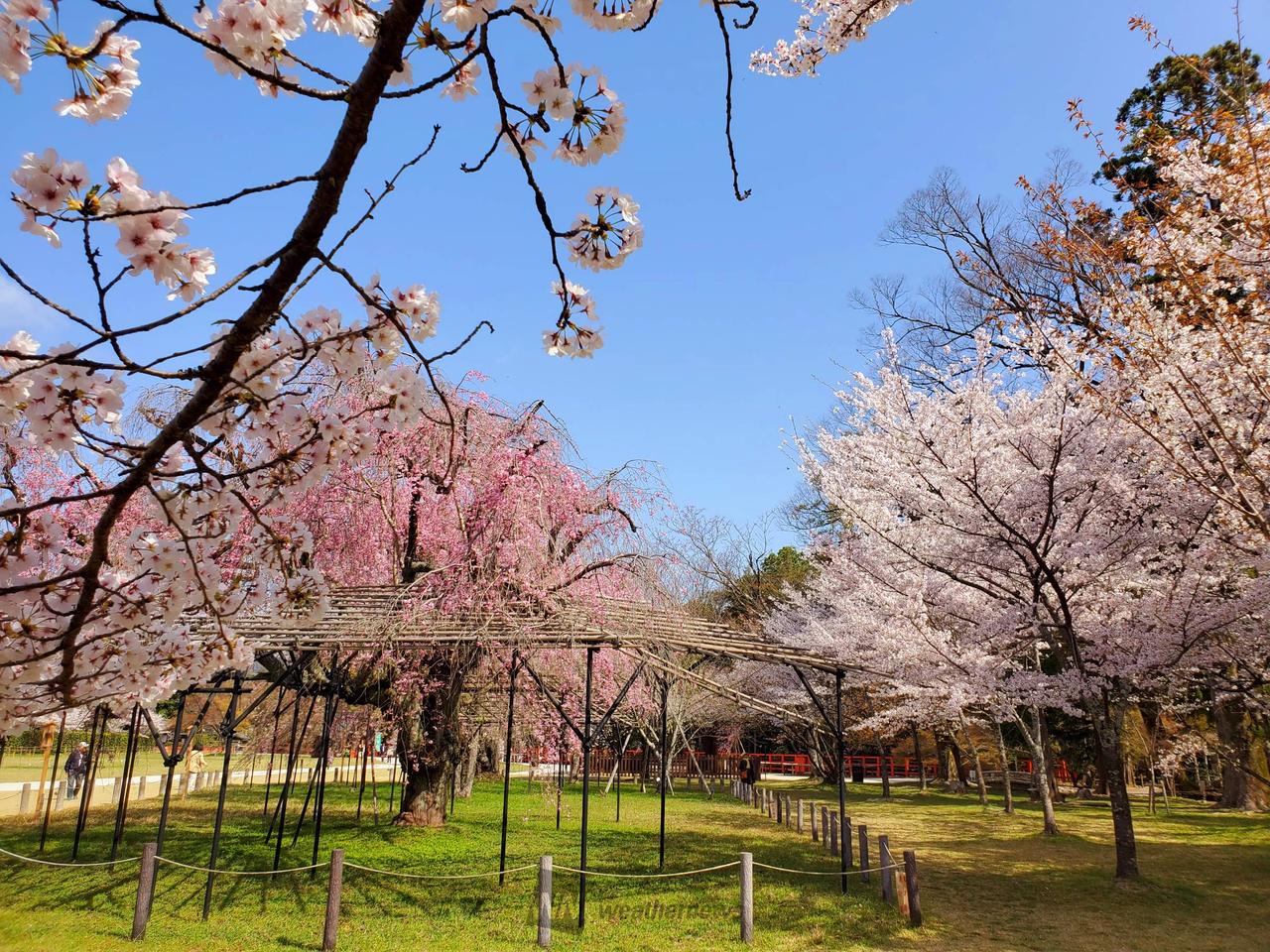 紅枝垂れ桜の斎王桜をはじめ、御所桜、風流桜など様々な種類の桜を3月中旬から4月中旬にかけて楽しめる。