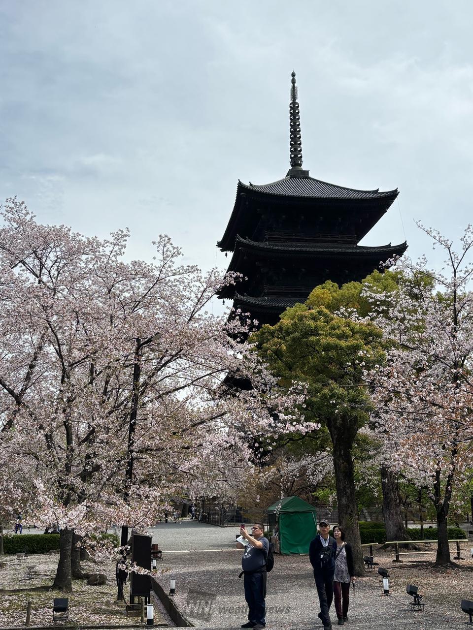 京都のランドマークの国宝五重塔を借景に境内の桜が咲き誇ります。