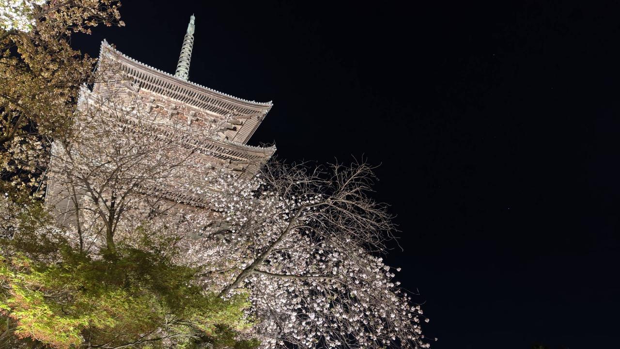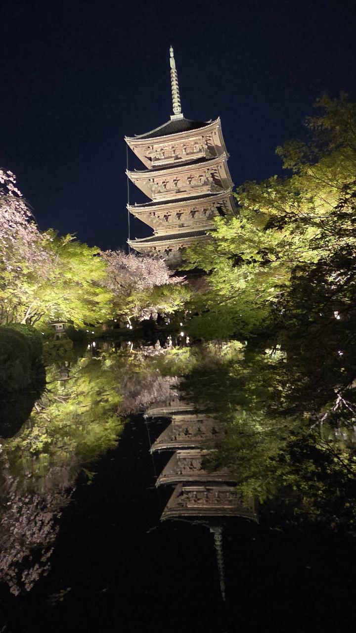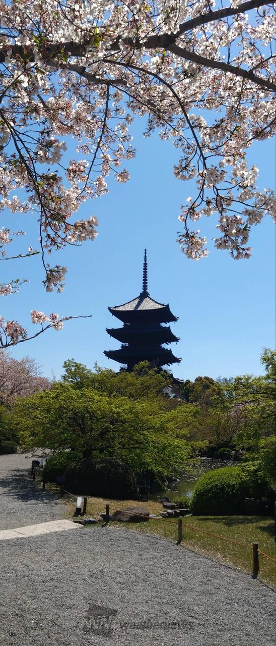 京都のランドマークの国宝五重塔を借景に境内の桜が咲き誇ります。