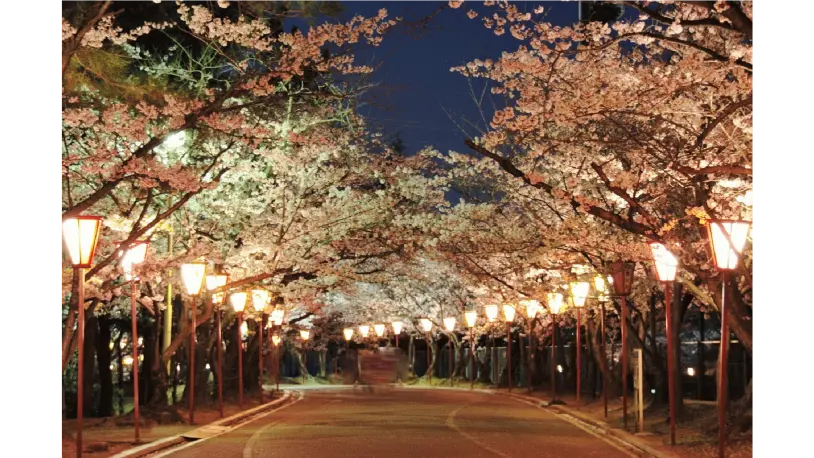 3月下旬~4月上旬になると約1000本の桜が公園全体に咲き誇り、ライトアップ期間は約300本ものぼんぼりも点灯されて花見客などで賑わう。