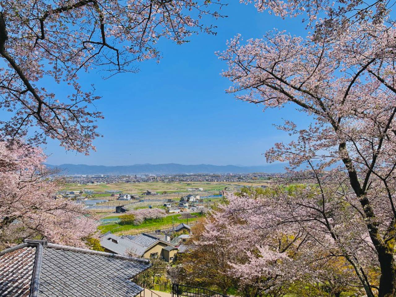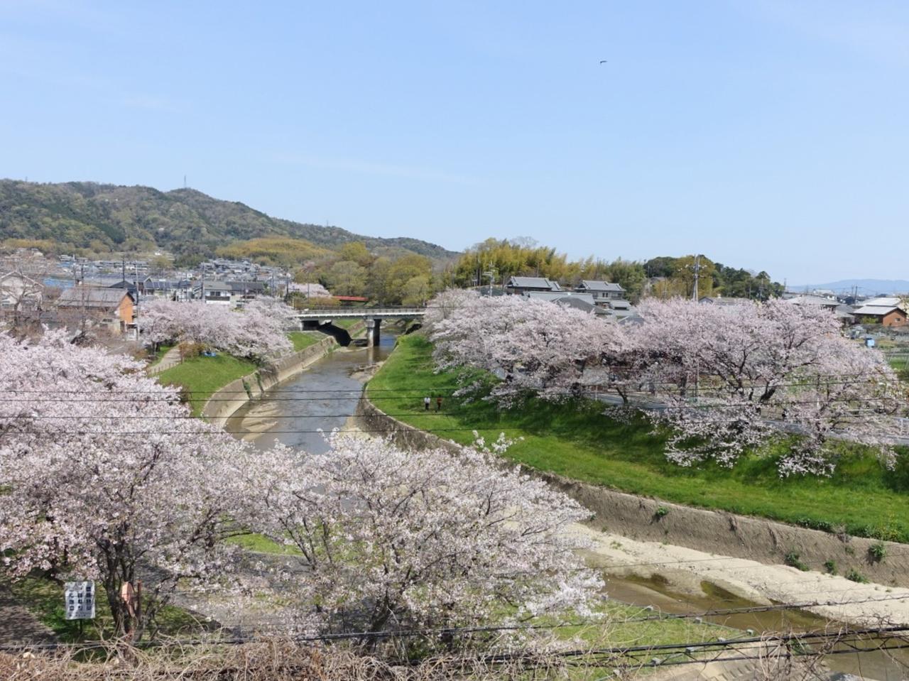 竜田公園は法隆寺で有名な斑鳩町の南西部、竜田川沿いにあります。百人一首に「ちはやぶる 神代も聞かず 竜田川 からくれなゐに 水くくるとは(在原業平)」「嵐ふく 三室の山の もみぢ葉は 竜田の川の 錦なりけり(能因法師)」と2首も詠われ、古くからもみじの名所として知られ、現在では桜の名所として、川沿いの桜並木や、三室山に咲いた桜が川面に映りこむ様子を楽しめます。三室山の山頂には能因法師の歌碑があります。