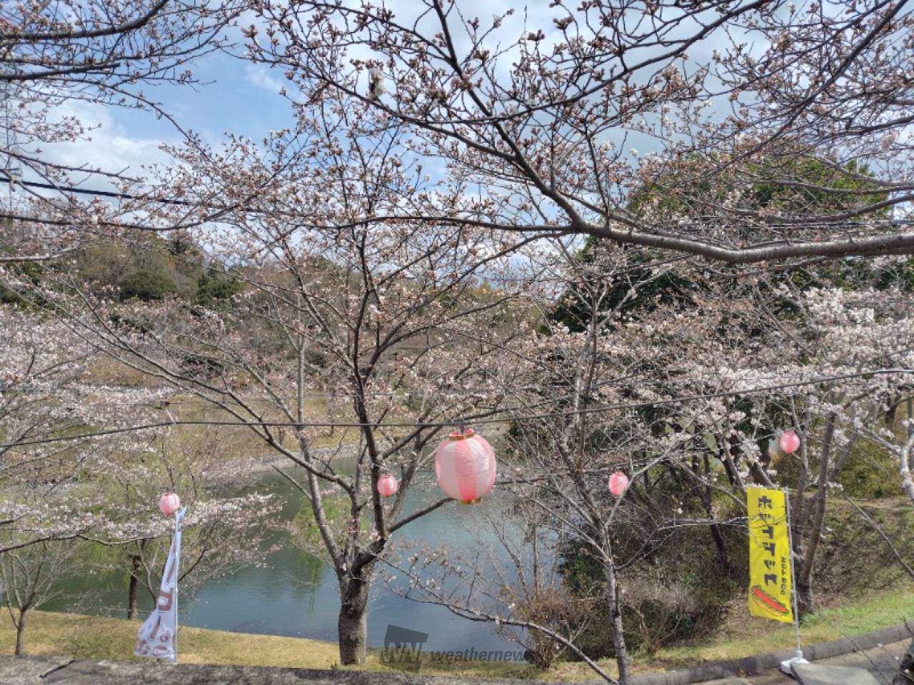 住民憩いの丸山公園では例年3月下旬から4月上旬にかけて池のほとりに植えられた桜が満開となります。日没後は提灯が灯され夜桜を堪能できます。