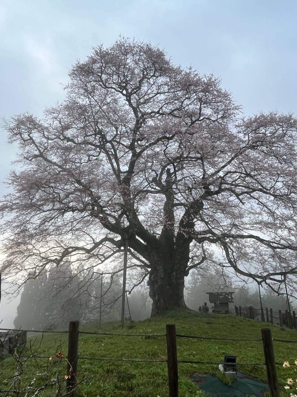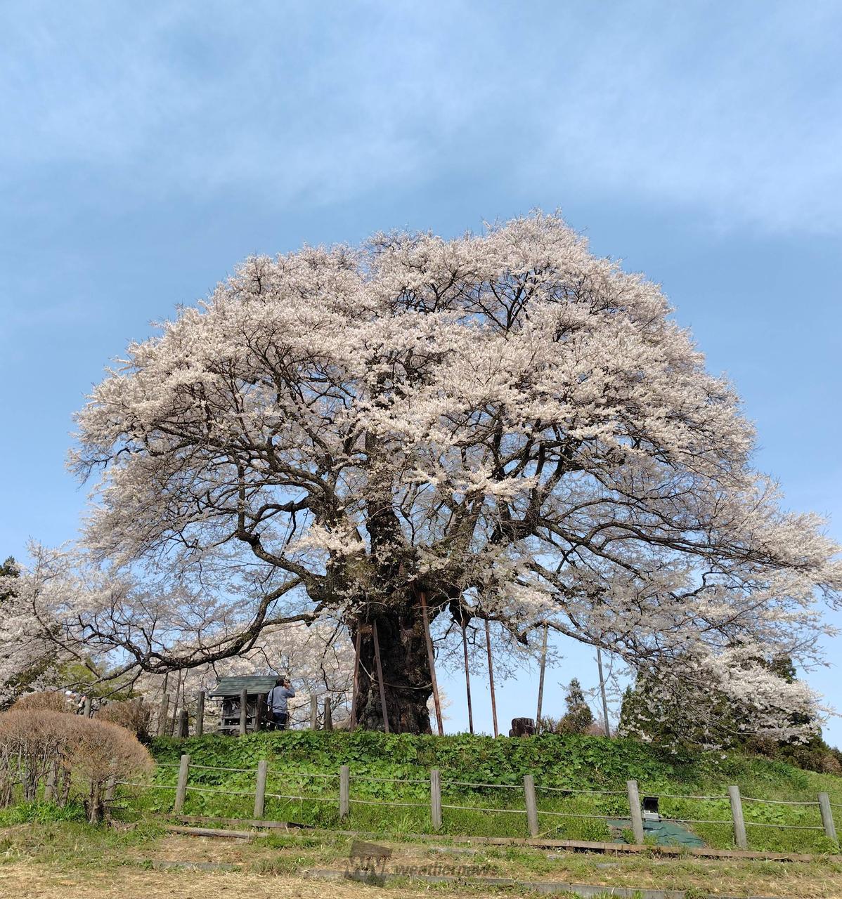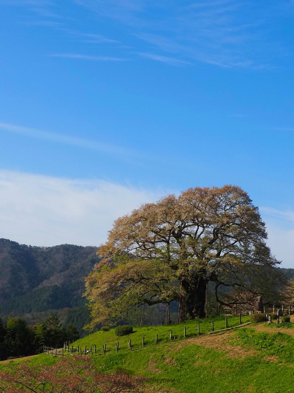 後醍醐天皇が隠岐配流の際にこの桜を見て賞賛したといわれ、推定樹齢は1000年、桜では県下一の巨木です。また、新日本名木百選にも選ばれ、県の天然記念物に指定されています。山里の丘陵にあって、堂々と天に向かってそびえ立つ姿は見事です。※桜付近での飲食はご遠慮ください。飲食は近くの休憩所をご利用ください。