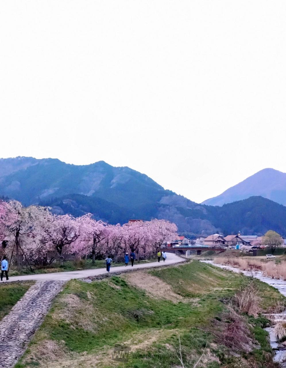 旧出雲街道宿場町の両側に植えられている133本の桜は、春には見事な桜のトンネルになり新庄村の春を代表する景色といわれる。通りの両側には水路があり、水の流れる音色は環境省選定の”残したい「日本の音風景百選」”に選ばれている。