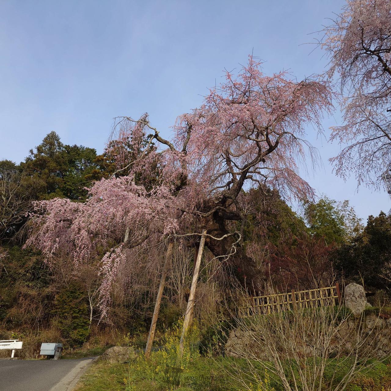 樹齢300年以上と推定される、幹回り2.42m、高さ10mの大木です。滝のように流れる枝いっぱいに花を咲かせた姿は圧巻で、百本のソメイヨシノよりも艶やかです。そばの2代目、近くの3代目の花も彩りを添えます。県の天然記念物に指定されています。
