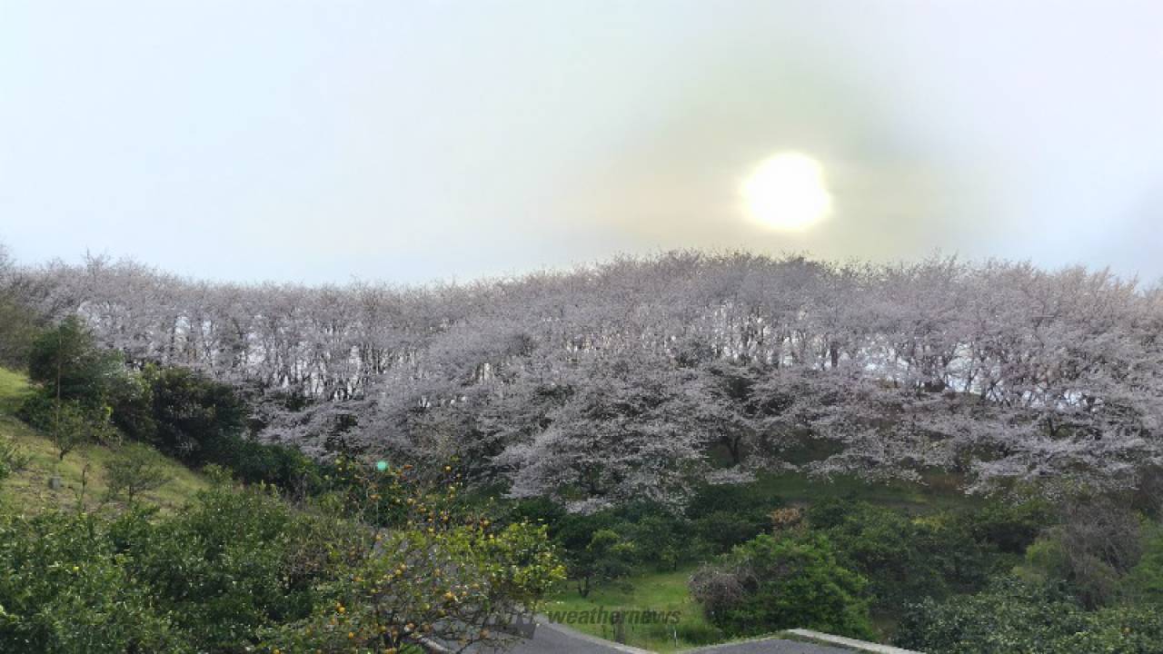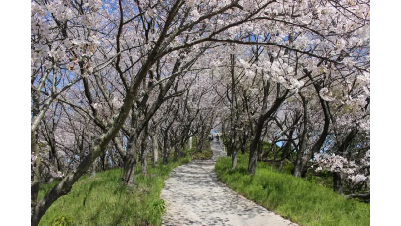 塔の峰は向田港から歩いていける小高い山。桜が満開の時期には、塔の峰を1周する道に桜のトンネルができあがります。