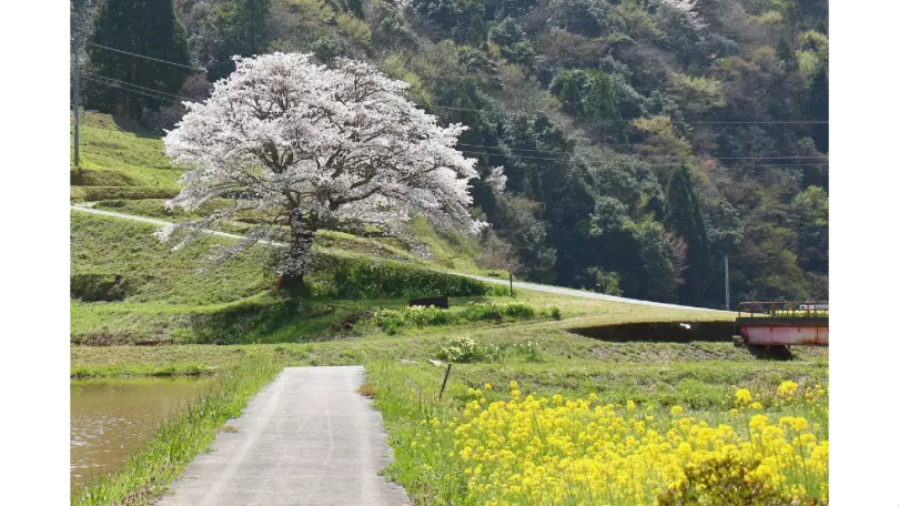 田園風景のなかにひっそりと立つ推定樹齢250年の山桜です。田んぼや小川、菜の花など周囲の環境も含めて一枚の絵画のような景色を楽しめます。