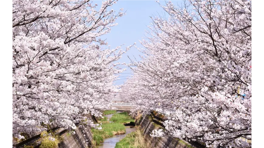 会下谷川桜並木の北側から南に向かってパチリ。 (東巌城町・昭和町のバス通りから)会下谷川桜並木の南側から北に向かってパチリ。 (上灘町・米田町のバス通りから)※北と南側は、なぜか開花も早く、桜が密集している。