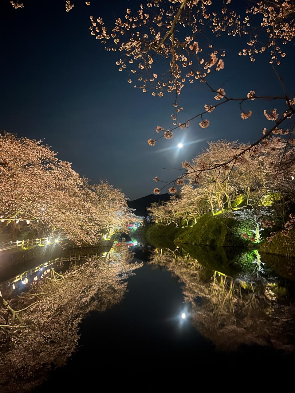 約400年前に築かれた城下町の中心に位置する鹿野城跡。春には城跡の堀に沿って植えられた約500本のソメイヨシノが満開となり、夜のライトアップでは、鏡のような堀の水面に映る幻想的な夜桜を写真に収めようと、多くの人で賑わいます。