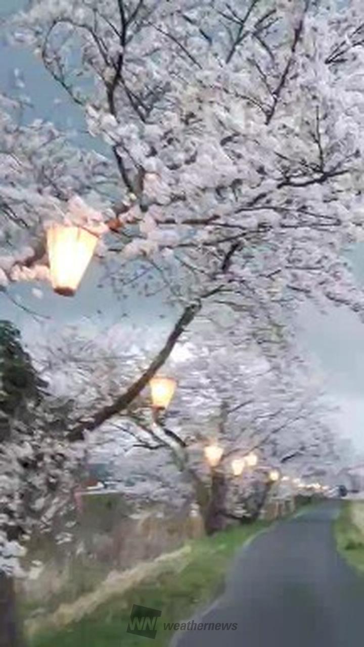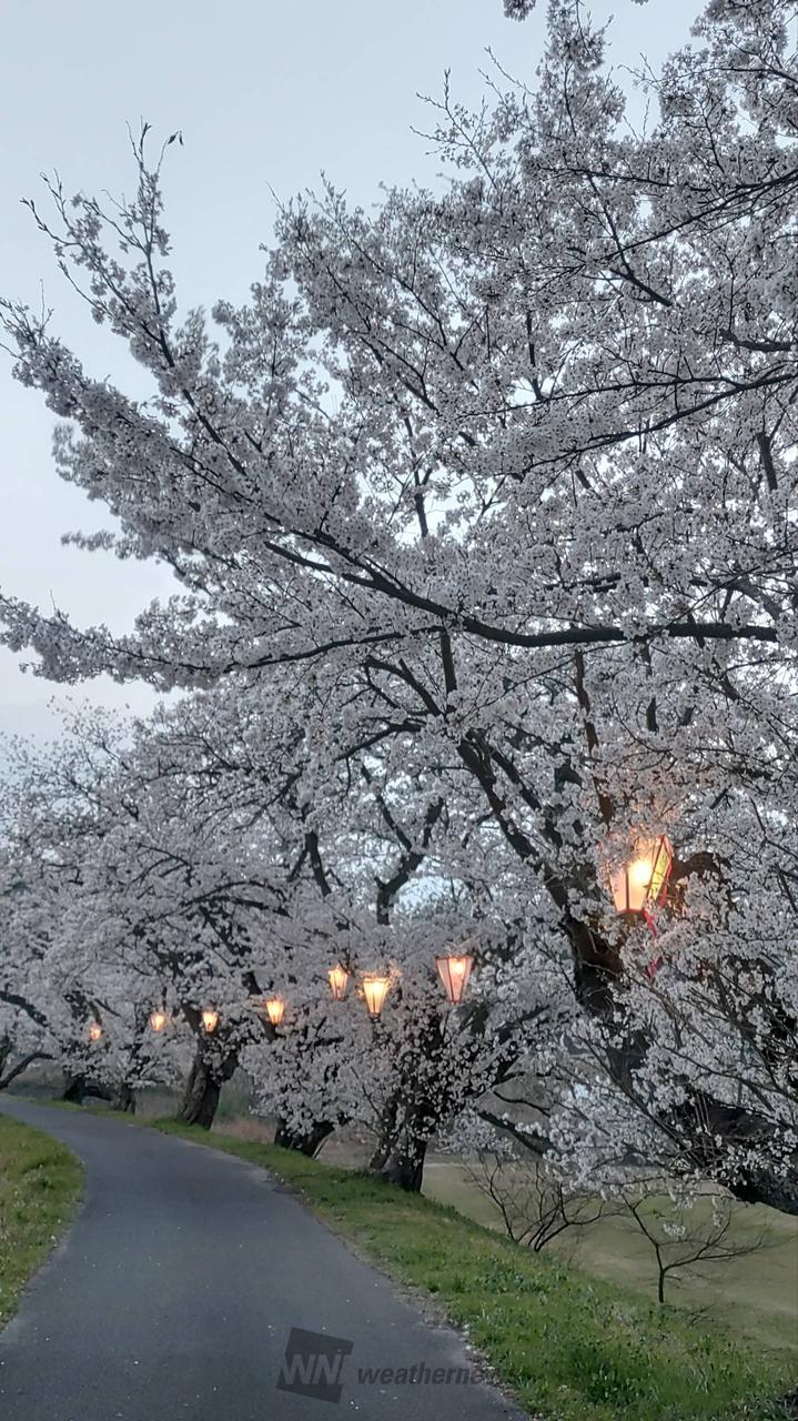 法勝寺城山公園及び法勝寺川の土手には約5.3kmにわたって桜並木が続いています。夜になりぼんぼりに灯りが灯ると、浮かび上がった桜が川面に映し出され、幻想的な雰囲気をかもしだします。