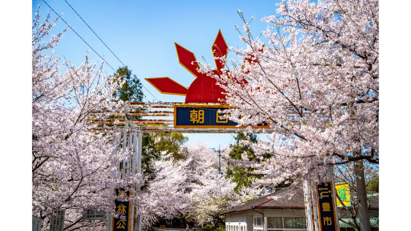 朝日山を登り始めると一面に咲き誇る約2000本の桜。頂上の資料館付近まで途切れることなく続いている光景は圧巻。子供からお年寄りまで楽しめる。