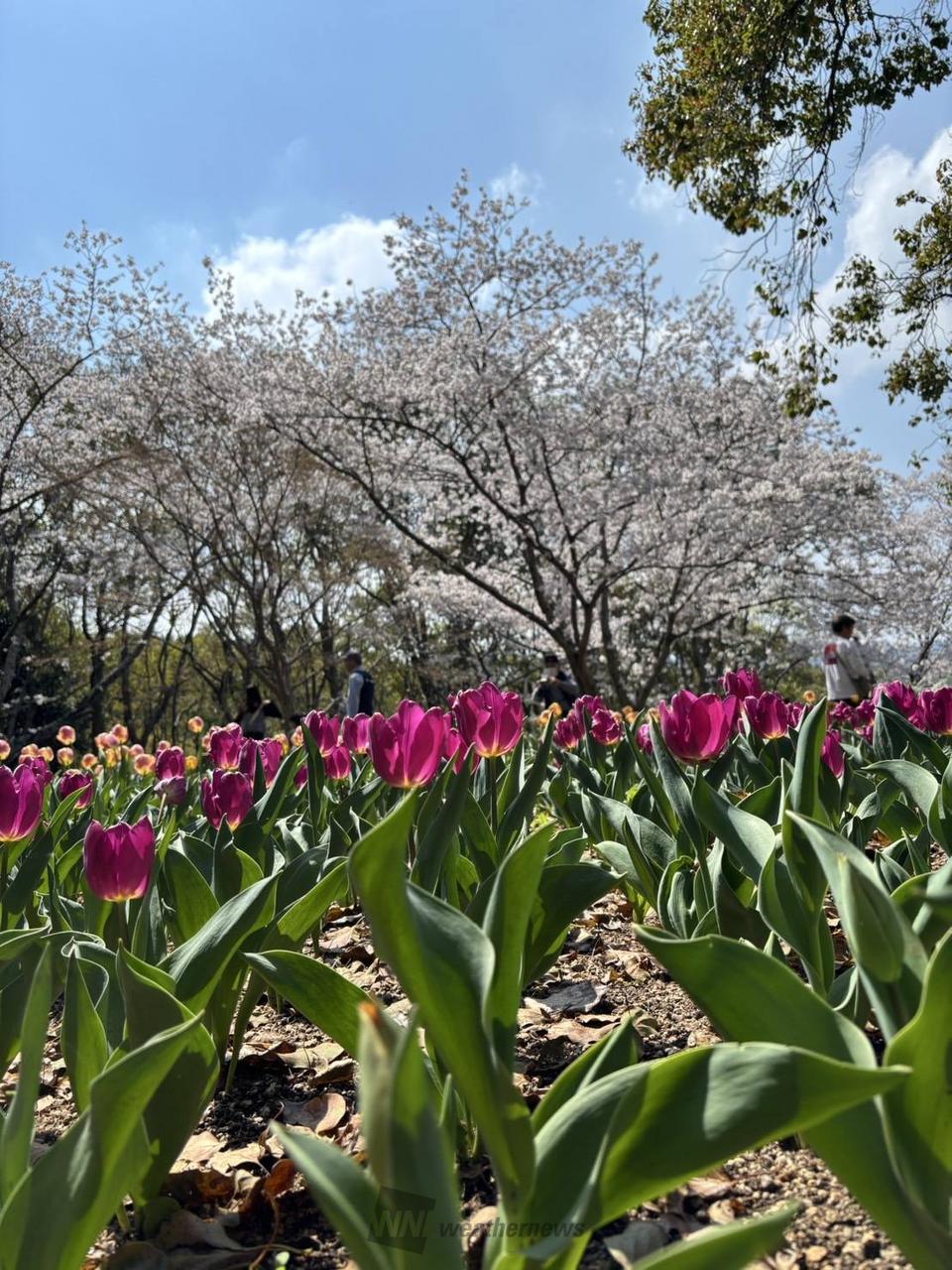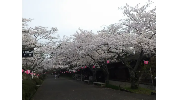 メイン通りの桜のトンネル(約500m)がお勧めです。チューリップ花壇との競演も最高です。芝生広場、チビッコ広場のほか、二子山(標高180m)のヤマザクラ、第3駐車場のヤエザクラ、レストハウス憩の家前のシダレザクラなどの見どころがたくさんあります。また、令和7年から行っているライトアップ(18~21時)では、昼間と違った幻想的な夜桜も楽しめます。