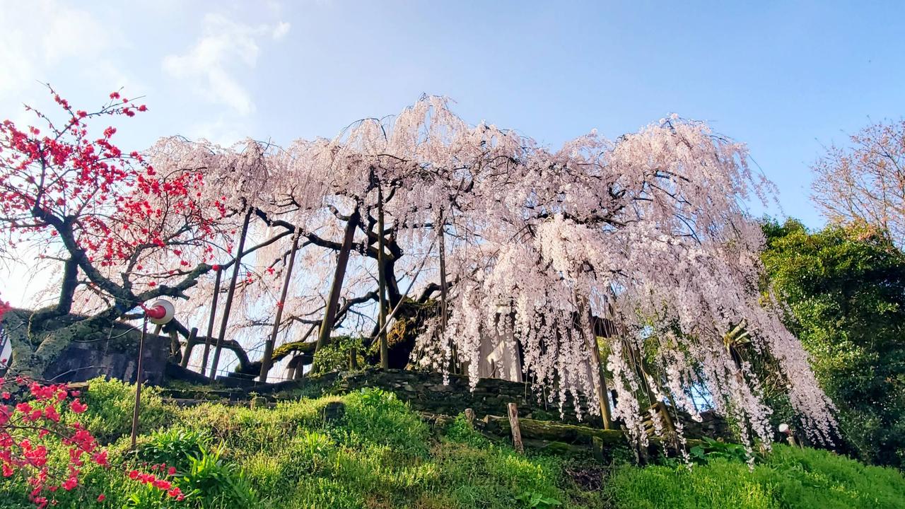 日本の原風景が広がる石畳地区。その中でも東地区にあるシダレザクラは樹齢350年を超える一本桜。満開となる時期の日曜日にはお祭りも開催されます。