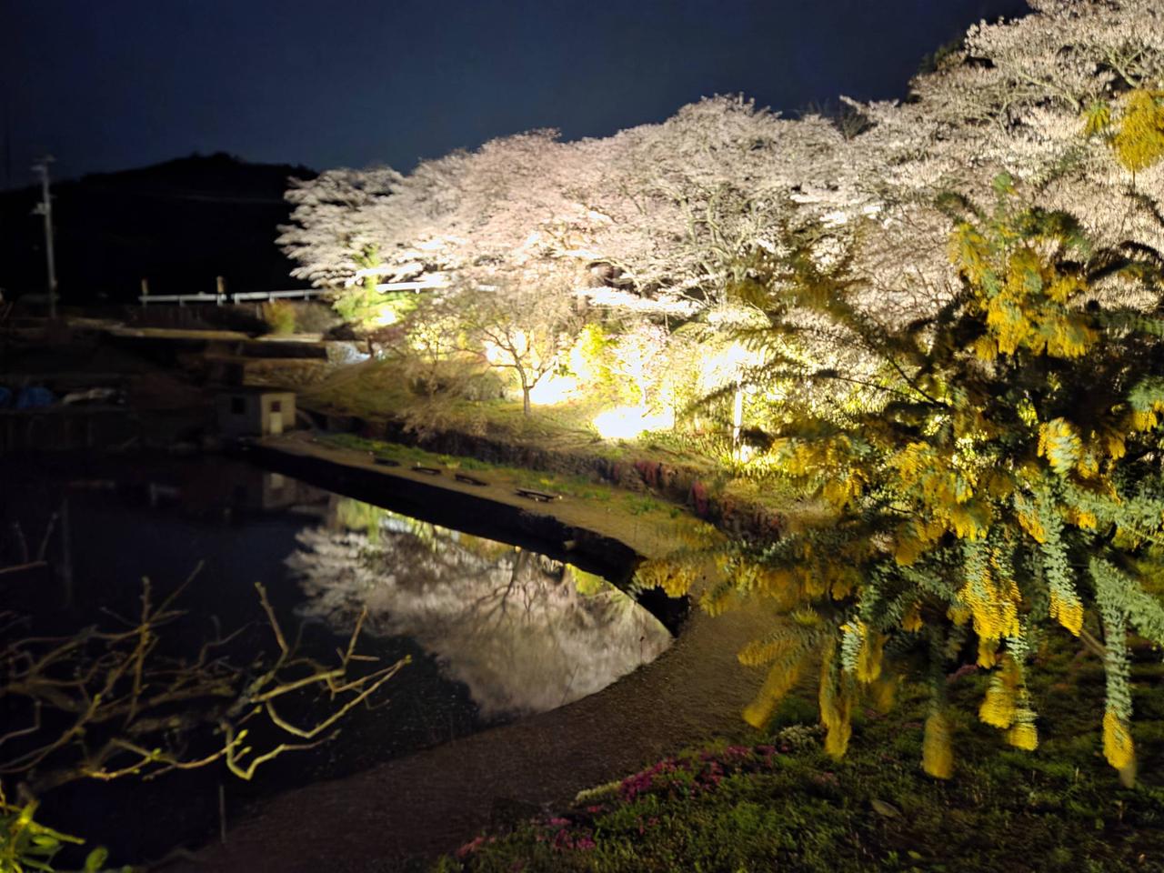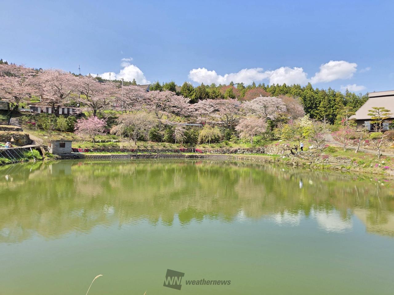 池を囲むような形で桜が咲き誇り、のどかな田舎風景を彩ります。桜が見頃となる週末には、地元の出店が並び温かく迎えてくれます。尾首地区までの道路は大変狭いため、コンパクトな車がおすすめです。