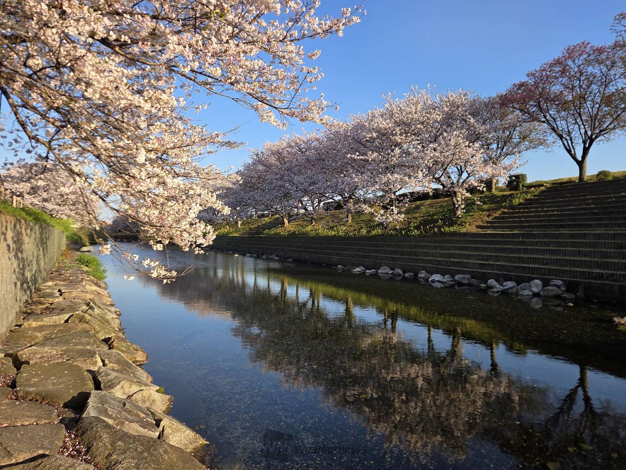 重信川の堤防沿いにある公園内には、ソメイヨシノのほか、陽光桜もあり、3月中旬から下旬にかけて、大ぶりで色鮮やかなピンクの花が園内を彩ります。また、堤防にはサイクリングロードが整備されています。休日などは駐車場の混雑が予想されますので、自転車や徒歩でお越しになることをお勧めします。