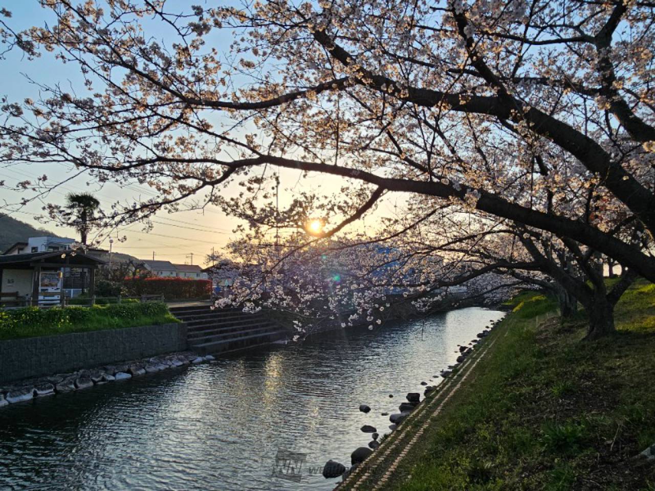 重信川の堤防沿いにある公園内には、ソメイヨシノのほか、陽光桜もあり、3月中旬から下旬にかけて、大ぶりで色鮮やかなピンクの花が園内を彩ります。また、堤防にはサイクリングロードが整備されています。休日などは駐車場の混雑が予想されますので、自転車や徒歩でお越しになることをお勧めします。