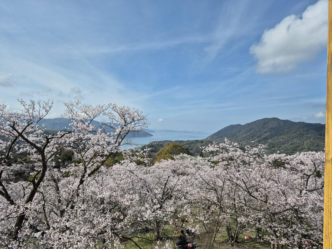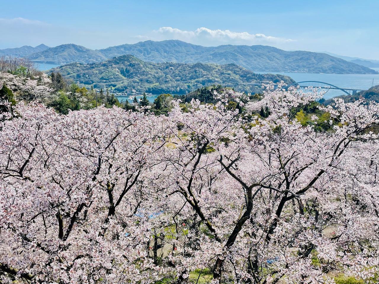 本州と四国を結ぶ「瀬戸内しまなみ海道」が通る伯方島の北西部、標高149mの開山山頂にある公園。展望台からは、伯方・大島大橋、大三島橋、多々羅大橋が一望でき、春にはソメイヨシノなど約1000本の桜が咲き乱れ、夜桜用に提灯も灯される。少し遅れて群生するツツジも見頃となる。
