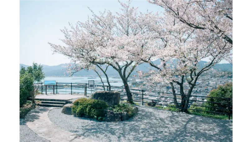 王子山公園から仙崎砂州を一望する事ができます。公園内には童謡詩人・金子みすゞの詩碑があり、「王子山」という詩のなかで「わたしの町はそのなかに、龍宮みたいに浮かんでる」と詠まれています。景色を一望しながら、詩の情景を味わうことが出来ます。