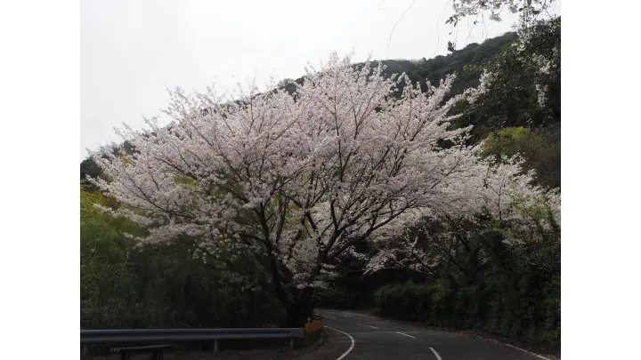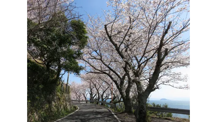 片添ヶ浜海浜公園から沖家室島までの県道60号線沿いに続く桜並木です。咲き誇る満開の桜がアーケードのように出迎えてくれます。