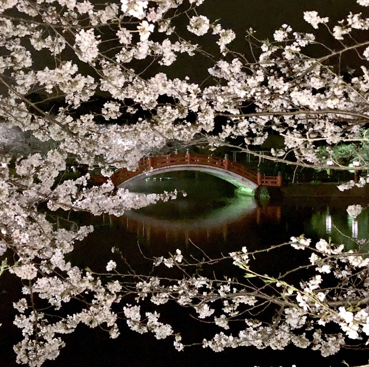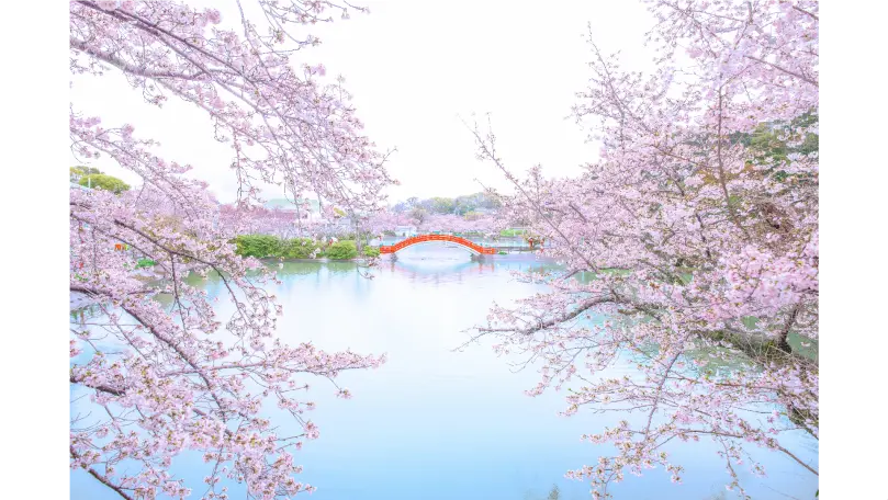 筑前中間さくら祭は、中間市最大の都市公園「垣生公園」にて3月下旬から4月上旬に開催されます。日中は桜に囲まれた垣生池と赤い延壽橋の鮮やかなコントラストが楽しめるほか、夜間は提灯や竹灯籠の幻想的な光が桜を彩ります。