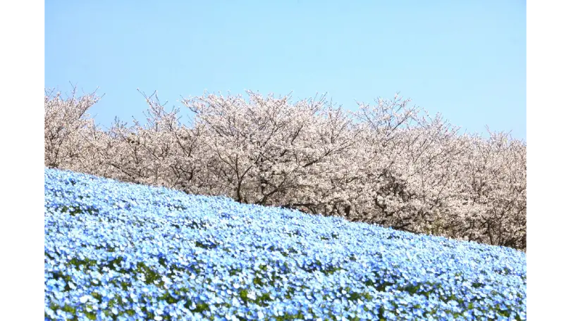 サイクリングコース沿いなどに、ソメイヨシノやオオシマザクラ約1600本が咲き誇ります。年によっては花の丘に咲くネモフィラのブルーとサクラのピンクがコラボレーションします。
