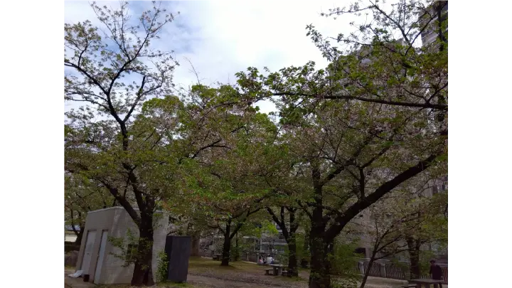旧福岡県庁跡地にあり、広大な芝生広場や国指定の重要文化財「貴賓館」などを有する天神中央公園は、花見の名所として知られています。薬院新川沿いのさくら広場に、ソメイヨシノやヤマザクラ、サトザクラなど約50本が植栽されており、例年3月下旬から4月上旬にかけて見頃を迎え、最盛期には川沿いに桜のトンネルが出現します。夜にはさくら並木がライトアップされ、幻想的な夜桜が鑑賞できます。