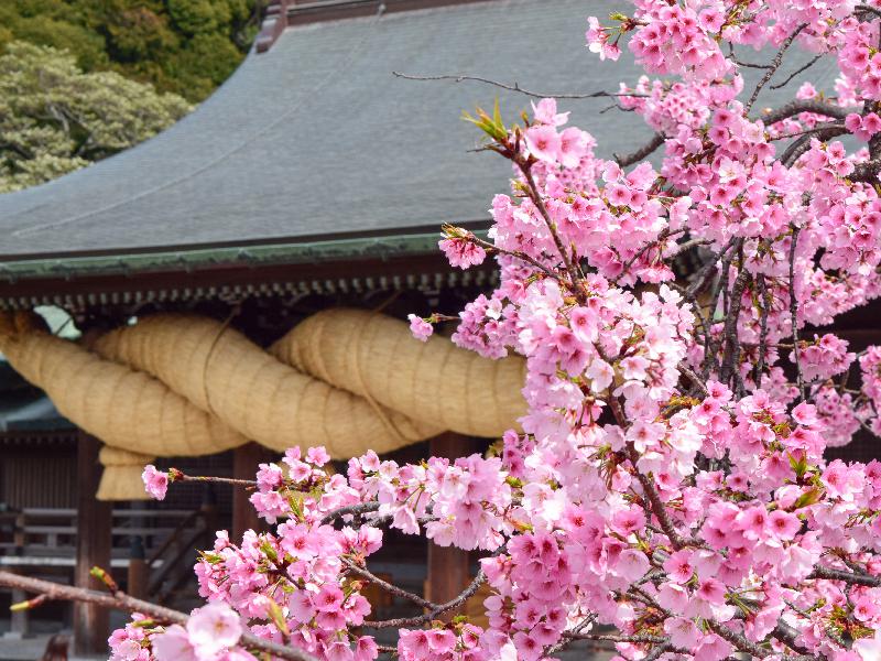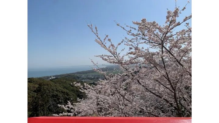 駐車場や本堂回廊から海と桜を望む景色