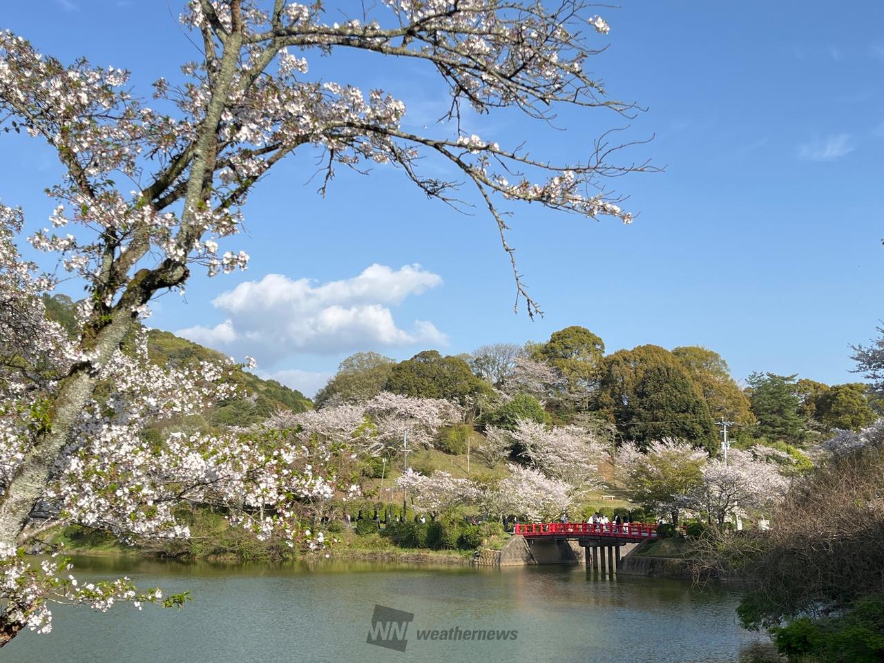 甘木公園、通称丸山公園は、県下屈指の桜の名所として知られています。公園の中央にあるひょうたん型の池をぐるりと囲むようにして、ソメイヨシノなど約4000本が咲き乱れます。池に映える満開の桜は圧巻です。夜には桜のライトアップとともに噴水のイルミネーションが楽しめます。