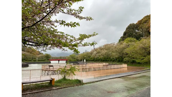 甘木公園、通称丸山公園は、県下屈指の桜の名所として知られています。公園の中央にあるひょうたん型の池をぐるりと囲むようにして、ソメイヨシノなど約4000本が咲き乱れます。池に映える満開の桜は圧巻です。夜には桜のライトアップとともに噴水のイルミネーションが楽しめます。