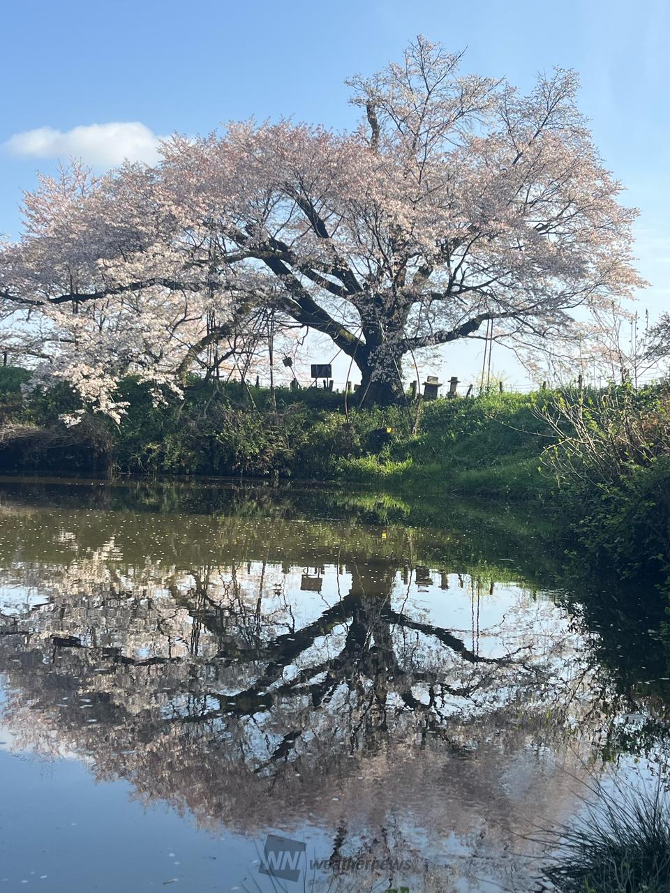 幹周り4.3m、高さ18mの山桜で樹齢約110年といわれ、地元で大切に保護されており、毎年見事な花を見ることができます。堂々たる風格で、花密度も高く、昼間・空の青さの残るため池に映る”逆さ桜”も一見の価値があります。※開花時期はソメイヨシノに対し1週間程遅れるのが通常です。