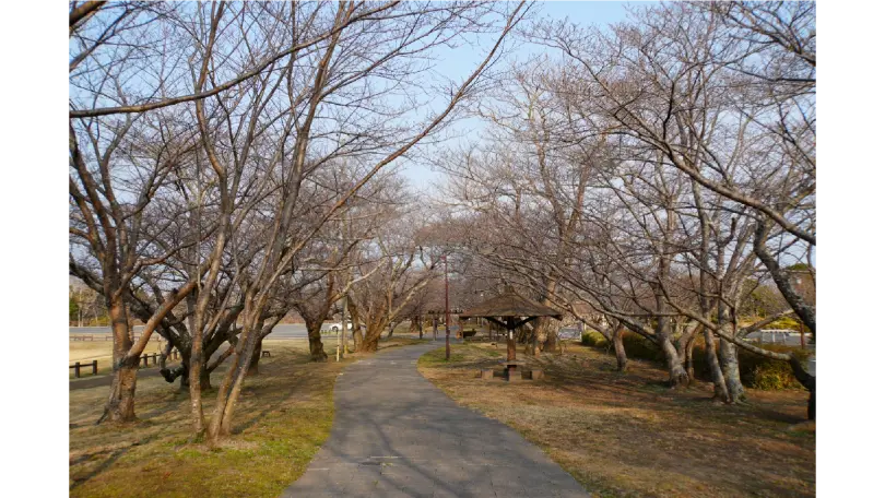 1.桜並木が歩道を覆いかぶさり、トンネルのようになっている。2.歩道なので子連れも安心して楽しめる。③屋根付きのベンチなども設置されているのでお花見に最適。