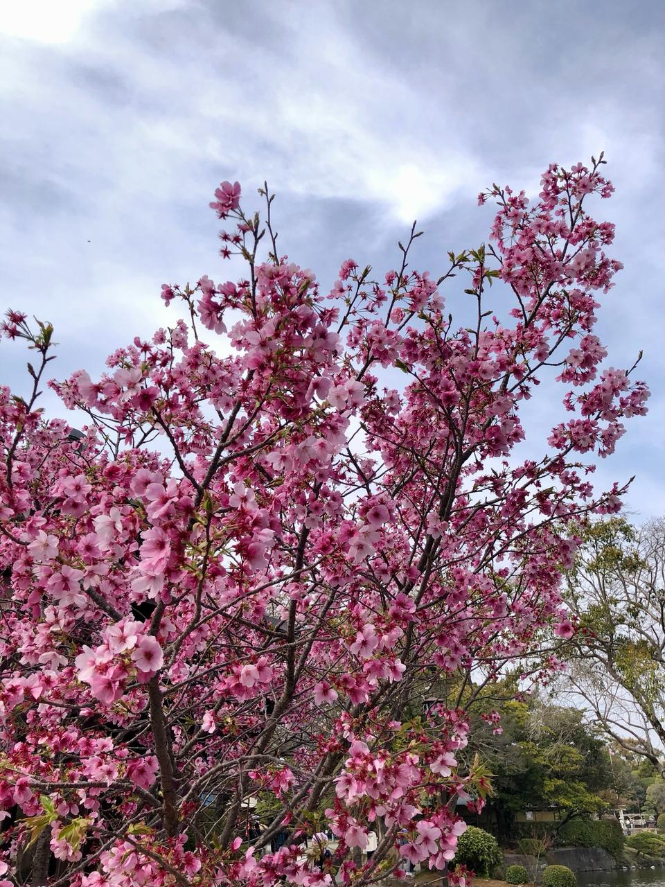 水前寺成趣園の築山の奥にピンクがかった桜が咲き乱れ、とても美しい景色が見られます。例年3月下旬から4月上旬が見頃です。