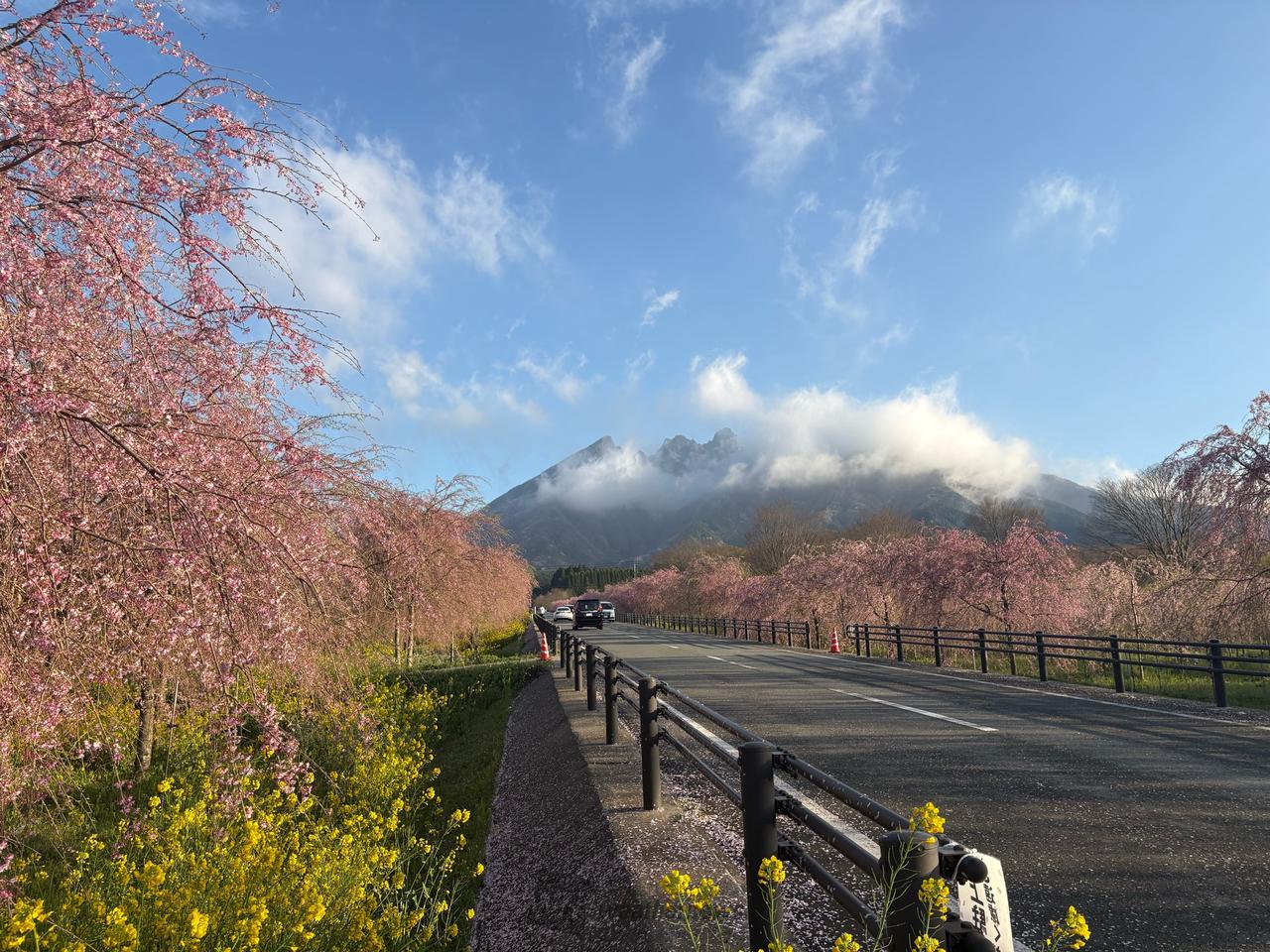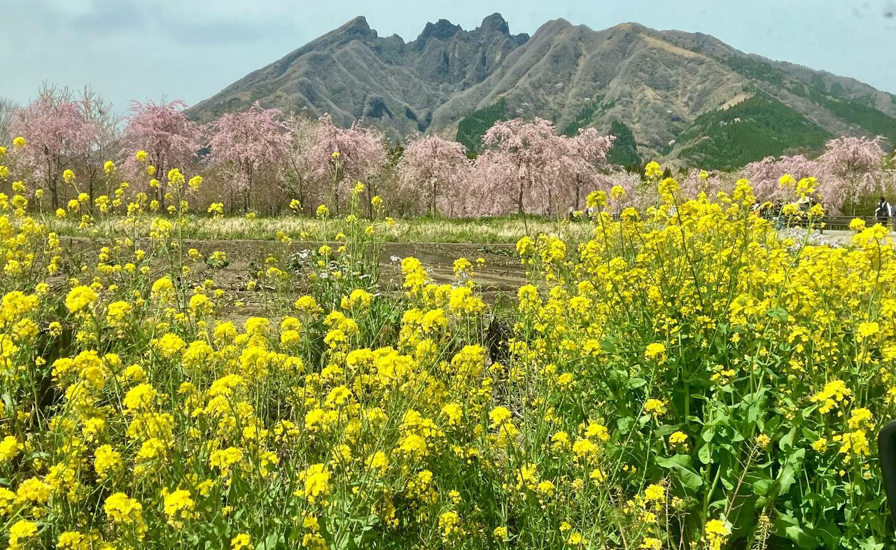 根子岳 × シダレザクラ × 菜の花の美しいコントラスト。しかも、この絶景は一ヶ所だけではありません。約2km続く並木道の中で、さまざまな角度から楽しむことができます。