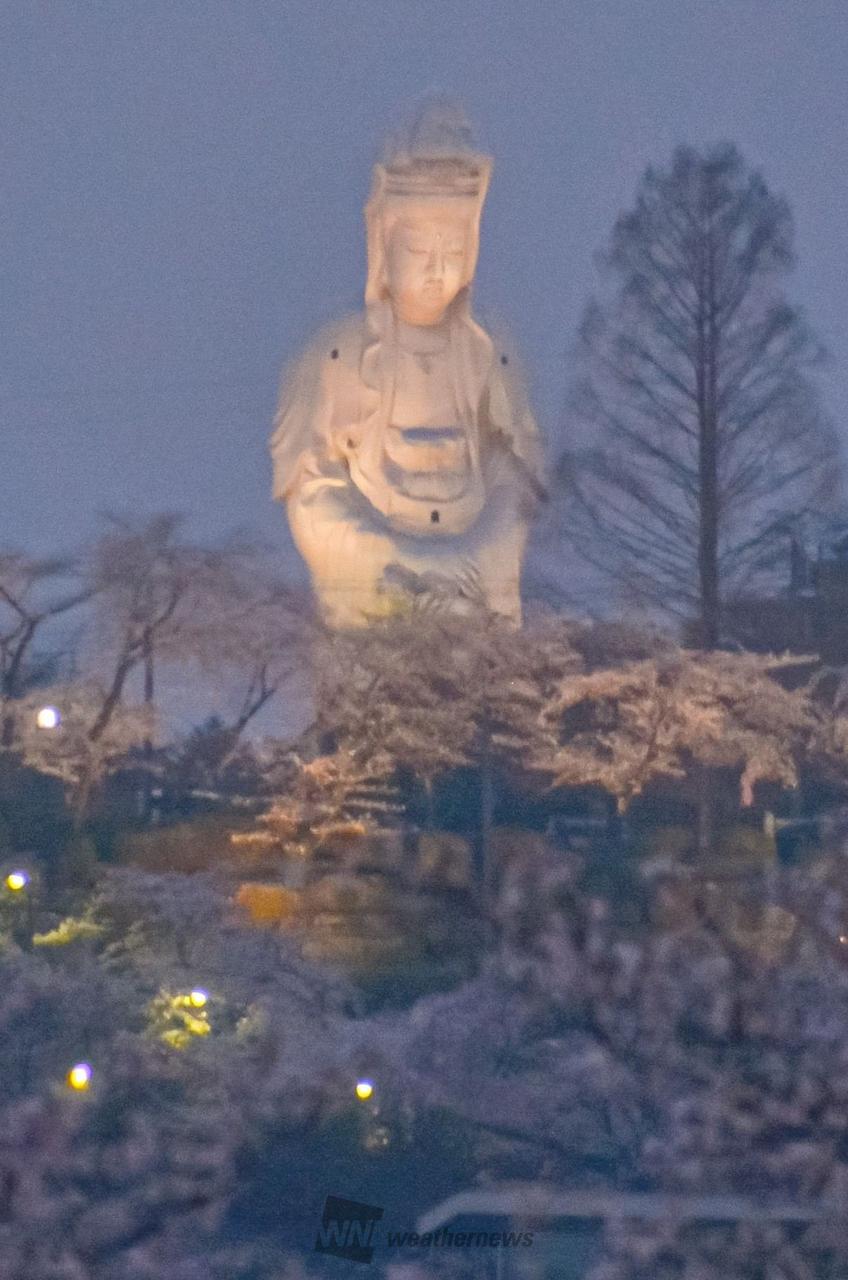 ソメイヨシノやヤマザクラなど約3000本が咲く中、参道にはみやげ店が軒を連ね、桜見物の人々で賑わいます。夜は市営観音山駐車場内の桜がライトアップされ、夜桜見物が出来ます。