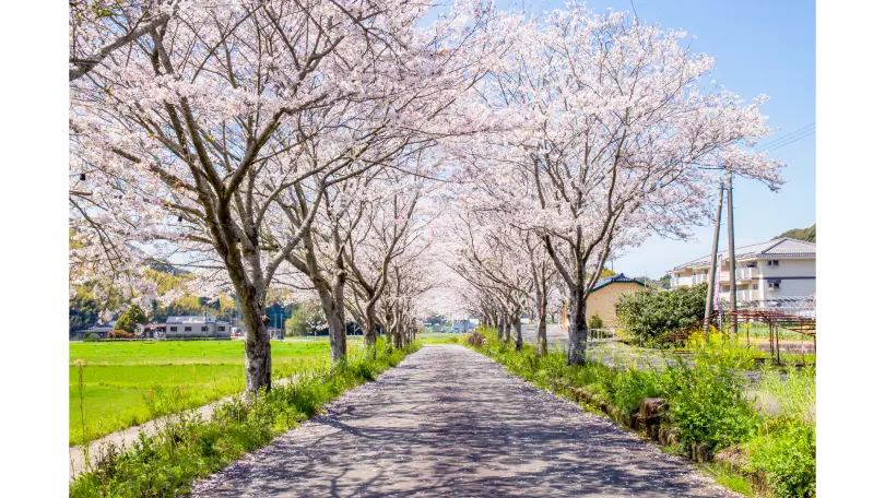 旧永野鉄道跡地の線路跡や車掌車両と桜並木が織りなす風景は、他ではなかなか見られないユニークなお花見体験です。満開になるとピンクの桜が古い線路と一緒に映え、撮影スポットとしても人気です。付近では菜の花も咲き、桜のピンクと菜の花の黄色のコントラストが春らしい景色を作ります。