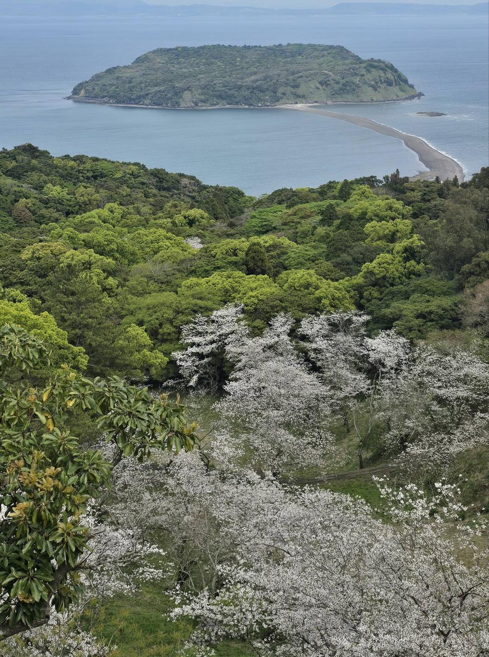 山頂まで車で登ることができ、山頂からは知林ヶ島や鹿児島湾(錦江湾)、指宿市街地をぐるりと見渡せます。約600本のソメイヨシノを堪能することができ、桜の名所にもなっています。見頃は、3月下旬~4月上旬です。