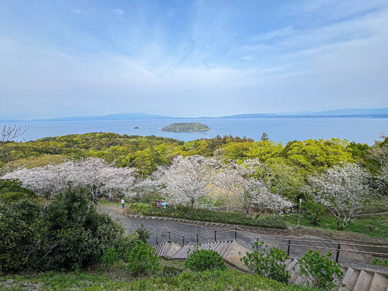 山頂まで車で登ることができ、山頂からは知林ヶ島や鹿児島湾(錦江湾)、指宿市街地をぐるりと見渡せます。約600本のソメイヨシノを堪能することができ、桜の名所にもなっています。見頃は、3月下旬~4月上旬です。