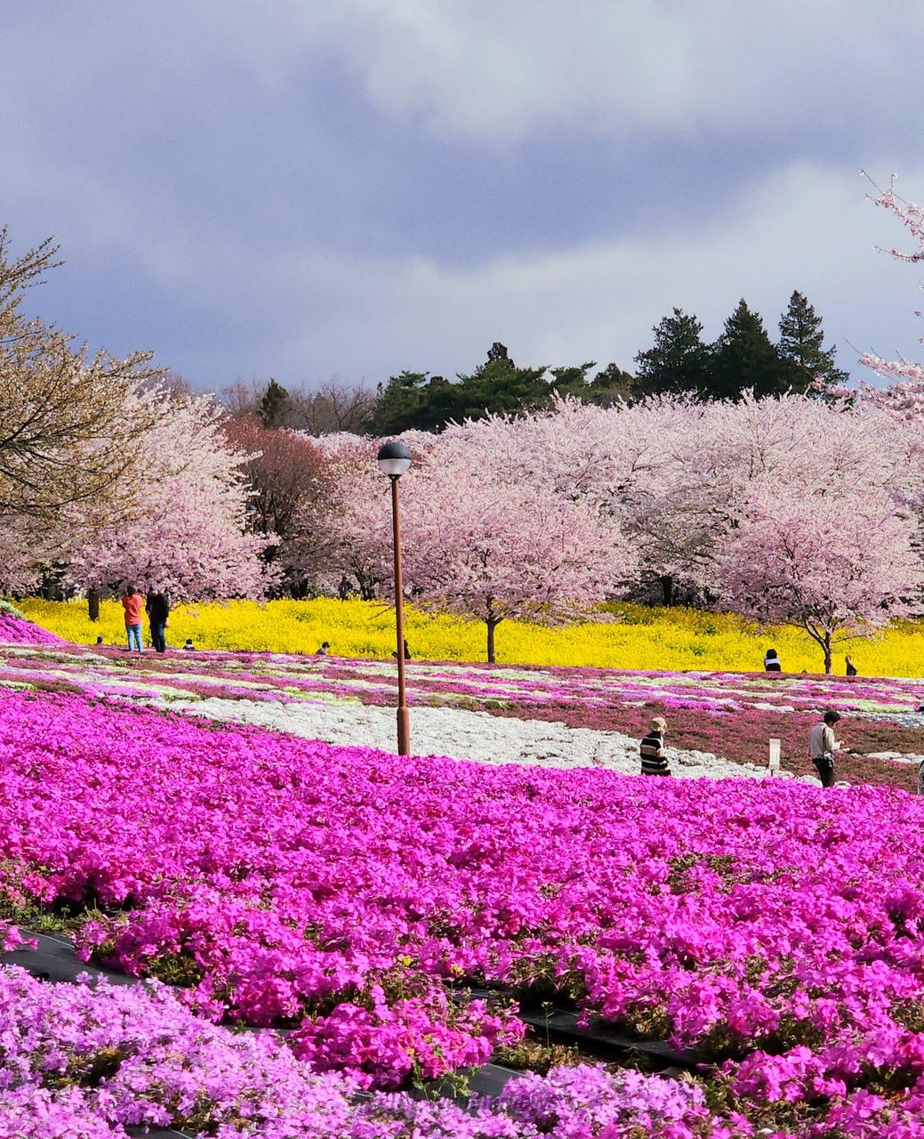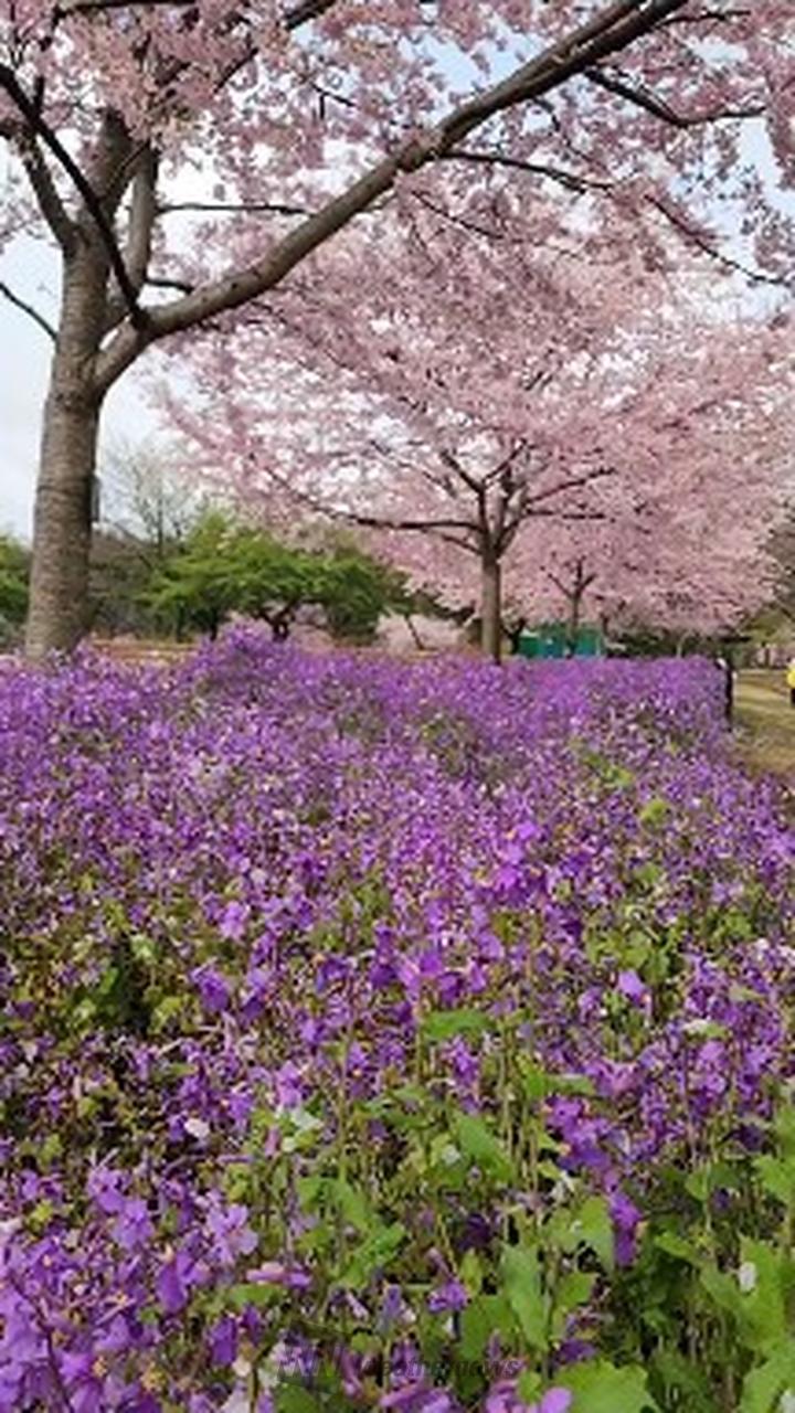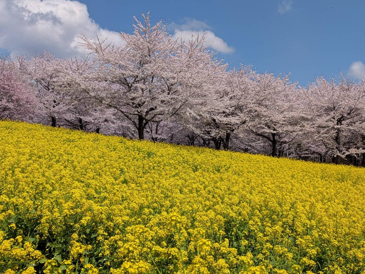 並木、隣接するみやぎ千本桜の森公園の菜の花越しの桜