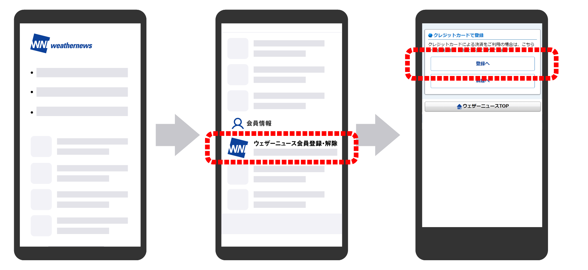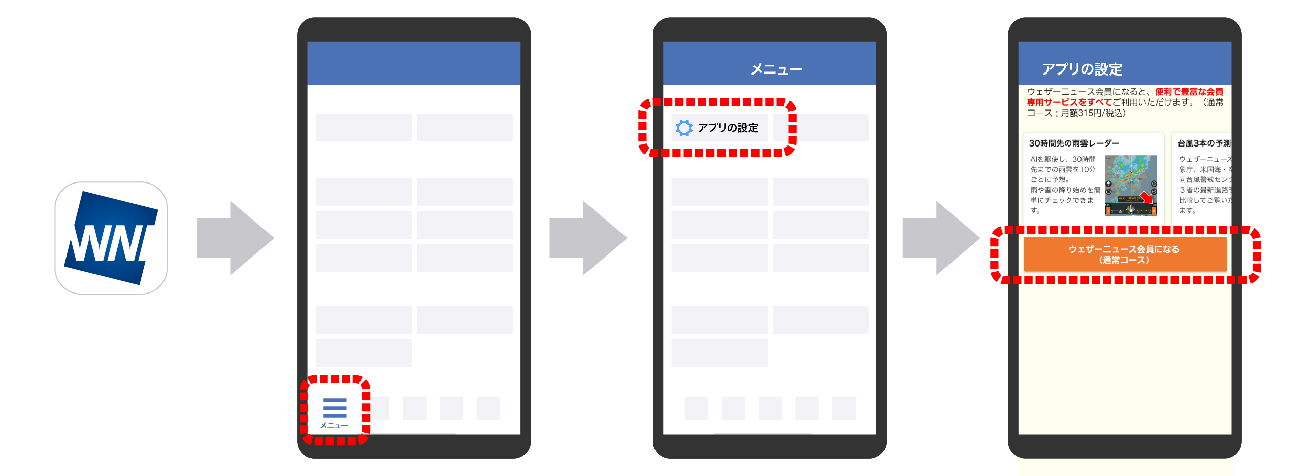 アプリ「ウェザーニュース」内で、通常コースに新規に登録します。1.スマートフォンでアプリ「ウェザーニュース」を開く2.左下メニューをタップ3.アプリの設定を開く4.「ウェザーニュース会員へご登録」に進む