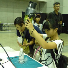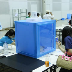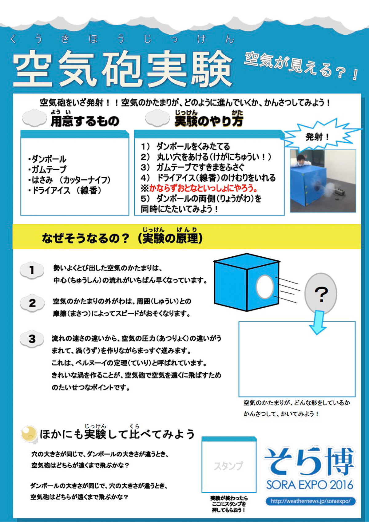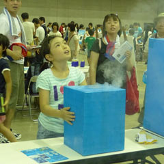 昨年も大人気だったブースが、学生の気象予報士のみなさんの力でパワーアップして再登場。箱から飛び出した空気がどのように変化していくのか、どこまで届くのか観察しましょう。